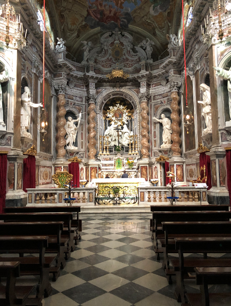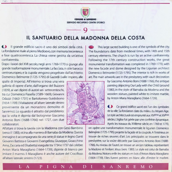 Tra i luoghi più amati dai sanremesi, un posto speciale lo occupa il Santuario di Nostra Signora della Costa, da tutti conosciuto più semplicemente come Madonna della Costa. Abbarbicato sulla collina che sovrasta la Città dei Fiori, questo centro di devozione, secondo la leggenda, venne eretto nel 1361 per celebrare la liberazione dal giogo feudale dei Doria. In quell’occasione, nacque quella che viene ricordata come la “festa delle catene”, una processione che i cittadini compivano trascinando fino al Santuario delle catene, in onore della libertà riconquistata. L’attuale struttura barocca, con pianta a croce latina, risale però al 1630 mentre la cupola, decorata all’interno da meravigliosi affreschi, venne eretta tra il 1770 e il 1775. Tradizione vuole che la ricostruzione del Santuario si debba a un marinaio che volle ringraziare la Madonna per averlo salvato dai pirati e al ritrovamento miracoloso di uno scrigno che permise di reperire le risorse necessarie, già in parte acquisite grazie a una colletta popolare cui gli abitanti parteciparono con grande generosità.