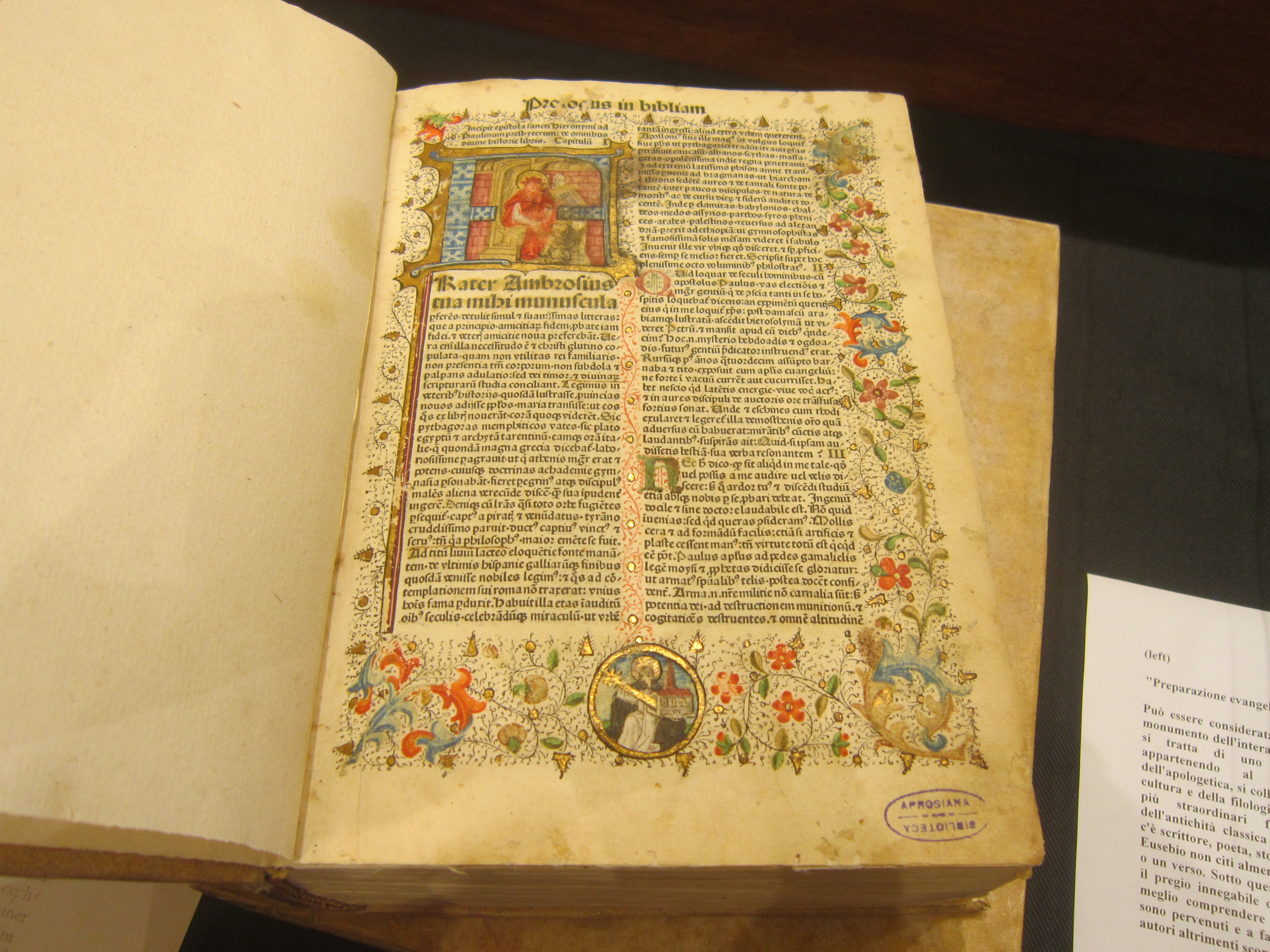 Помимо рукописи Апрозио, в библиотеке хранится Библия, датированная 1480 годом, различные инкунаболы, несколько драгоценных печатных книг, относящихся ко второй половине пятнадцатого века. Кроме того, старый фонд содержит редкие рукописи, часто написанные различными учеными. Как, например, рукопись исследовательницы из Кэмбриджа, портрет которой появится на обложке академической книги, посвященной библиотеке и ее сокровищам. “Aprosiana”, которой сегодня руководит энтузиаст Руджеро Марро, гордится своими библиотекарями, в числе которых был писатель Франческо Бьямонти, возглавлявший ее в 50-60-е годы.